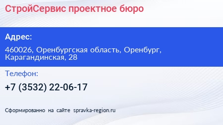 СтройСервис, проектное бюро по адресу 460026, Оренбургская область, Оренбург, Карагандинская, 28 в дальнейшем Организация, размещена в следующих категориях: