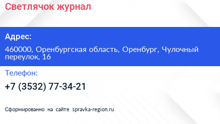 Светлячок, журнал по адресу 460000, Оренбургская область, Оренбург, Чулочный переулок, 16 в дальнейшем Организация, размещена в следующих категориях: