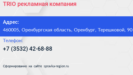 TRIO, рекламная компания по адресу 460005, Оренбургская область, Оренбург, Терешковой, 90 в дальнейшем Организация, размещена в следующих категориях: