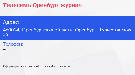 Телесемь-Оренбург, журнал по адресу 460024, Оренбургская область, Оренбург, Туркестанская, 5а в дальнейшем Организация, размещена в следующих категориях: