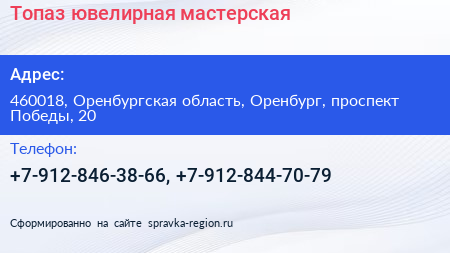 Топаз, ювелирная мастерская по адресу 460018, Оренбургская область, Оренбург, проспект Победы, 20 в дальнейшем Организация, размещена в следующих категориях: