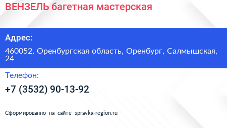 ВЕНЗЕЛЬ, багетная мастерская по адресу 460052, Оренбургская область, Оренбург, Салмышская, 24 в дальнейшем Организация, размещена в следующих категориях: