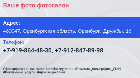 Ваше фото, фотосалон по адресу 460047, Оренбургская область, Оренбург, Дружбы, 16 в дальнейшем Организация, размещена в следующих категориях: