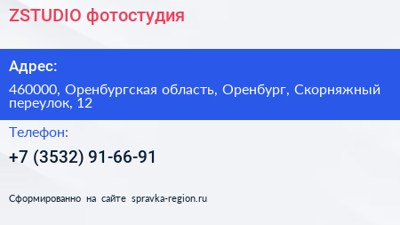 ZSTUDIO, фотостудия по адресу 460000, Оренбургская область, Оренбург, Скорняжный переулок, 12 в дальнейшем Организация, размещена в следующих категориях: