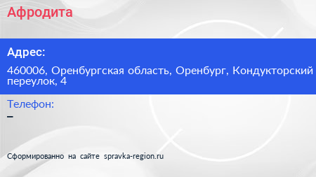 Афродита по адресу 460006, Оренбургская область, Оренбург, Кондукторский переулок, 4 в дальнейшем Организация, размещена в следующих категориях: