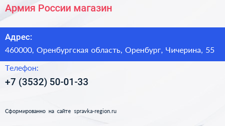 Армия России, магазин по адресу 460000, Оренбургская область, Оренбург, Чичерина, 55 в дальнейшем Организация, размещена в следующих категориях: