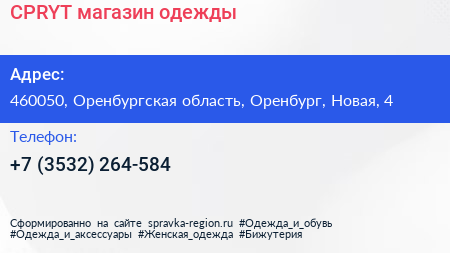 CPRYT, магазин одежды по адресу 460050, Оренбургская область, Оренбург, Новая, 4 в дальнейшем Организация, размещена в следующих категориях: