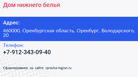 Дом нижнего белья по адресу 460000, Оренбургская область, Оренбург, Володарского, 20 в дальнейшем Организация, размещена в следующих категориях: