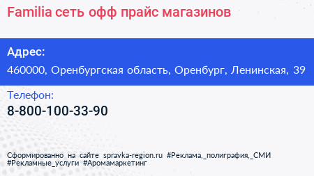 Familia, сеть офф-прайс магазинов по адресу 460000, Оренбургская область, Оренбург, Ленинская, 39 в дальнейшем Организация, размещена в следующих категориях: