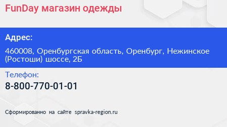 FunDay, магазин одежды по адресу 460008, Оренбургская область, Оренбург, Нежинское (Ростоши) шоссе, 2Б в дальнейшем Организация, размещена в следующих категориях: