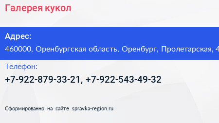 Галерея кукол по адресу 460000, Оренбургская область, Оренбург, Пролетарская, 4 в дальнейшем Организация, размещена в следующих категориях: