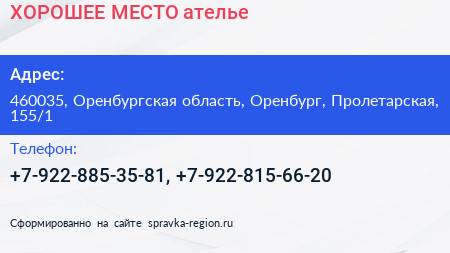 ХОРОШЕЕ МЕСТО, ателье по адресу 460035, Оренбургская область, Оренбург, Пролетарская, 155/1 в дальнейшем Организация, размещена в следующих категориях:
