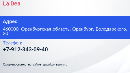 La Dea по адресу 460000, Оренбургская область, Оренбург, Володарского, 20 в дальнейшем Организация, размещена в следующих категориях: