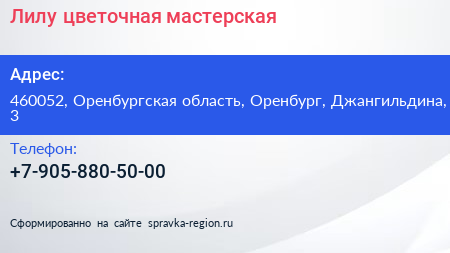 Лилу, цветочная мастерская по адресу 460052, Оренбургская область, Оренбург, Джангильдина, 3 в дальнейшем Организация, размещена в следующих категориях: