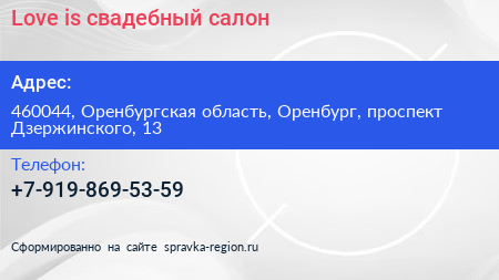 Love is, свадебный салон по адресу 460044, Оренбургская область, Оренбург, проспект Дзержинского, 13 в дальнейшем Организация, размещена в следующих категориях: