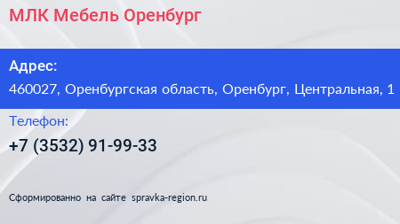 МЛК Мебель Оренбург по адресу 460027, Оренбургская область, Оренбург, Центральная, 1 в дальнейшем Организация, размещена в следующих категориях: