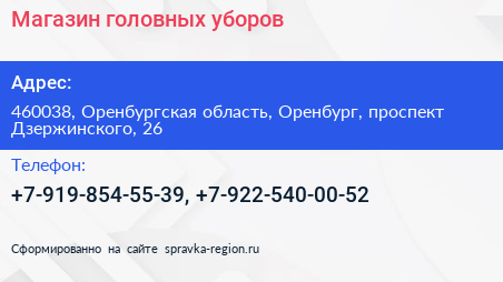 Магазин головных уборов по адресу 460038, Оренбургская область, Оренбург, проспект Дзержинского, 26 в дальнейшем Организация, размещена в следующих категориях: