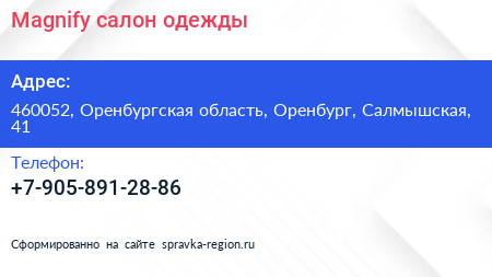 Magnify, салон одежды по адресу 460052, Оренбургская область, Оренбург, Салмышская, 41 в дальнейшем Организация, размещена в следующих категориях: