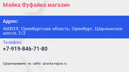 Майка-Фуфайка, магазин по адресу 460019, Оренбургская область, Оренбург, Шарлыкское шоссе, 1/2 в дальнейшем Организация, размещена в следующих категориях: