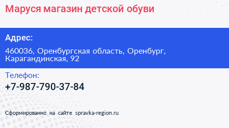 Маруся, магазин детской обуви по адресу 460036, Оренбургская область, Оренбург, Карагандинская, 92 в дальнейшем Организация, размещена в следующих категориях: