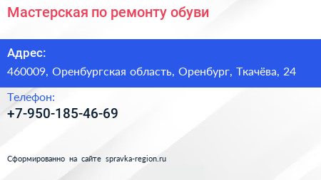 Мастерская по ремонту обуви по адресу 460009, Оренбургская область, Оренбург, Ткачёва, 24 в дальнейшем Организация, размещена в следующих категориях: