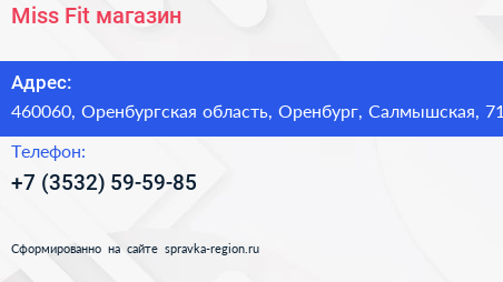 Miss Fit, магазин по адресу 460060, Оренбургская область, Оренбург, Салмышская, 71 в дальнейшем Организация, размещена в следующих категориях: