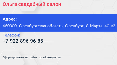 Ольга, свадебный салон по адресу 460000, Оренбургская область, Оренбург, 8 Марта, 40 к2 в дальнейшем Организация, размещена в следующих категориях: