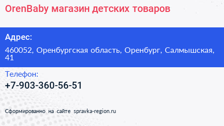 OrenBaby, магазин детских товаров по адресу 460052, Оренбургская область, Оренбург, Салмышская, 41 в дальнейшем Организация, размещена в следующих категориях: