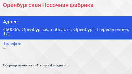 Оренбургская Носочная фабрика по адресу 460036, Оренбургская область, Оренбург, Переселенцев, 1/1 в дальнейшем Организация, размещена в следующих категориях: