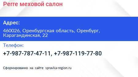 Perre, меховой салон по адресу 460026, Оренбургская область, Оренбург, Карагандинская, 22 в дальнейшем Организация, размещена в следующих категориях: