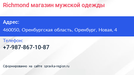 Richmond, магазин мужской одежды по адресу 460050, Оренбургская область, Оренбург, Новая, 4 в дальнейшем Организация, размещена в следующих категориях:
