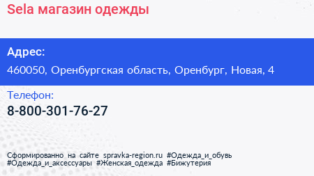 Sela, магазин одежды по адресу 460050, Оренбургская область, Оренбург, Новая, 4 в дальнейшем Организация, размещена в следующих категориях: