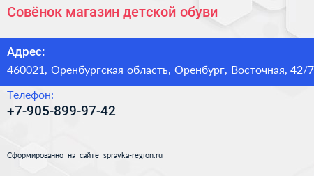 Совёнок, магазин детской обуви по адресу 460021, Оренбургская область, Оренбург, Восточная, 42/7 в дальнейшем Организация, размещена в следующих категориях: