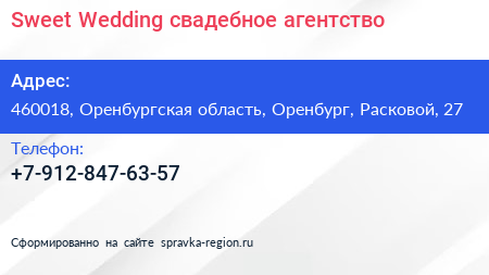 Sweet Wedding, свадебное агентство по адресу 460018, Оренбургская область, Оренбург, Расковой, 27 в дальнейшем Организация, размещена в следующих категориях: