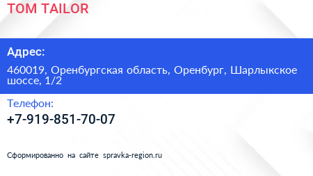 TOM TAILOR по адресу 460019, Оренбургская область, Оренбург, Шарлыкское шоссе, 1/2 в дальнейшем Организация, размещена в следующих категориях: