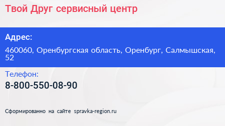 Твой Друг, сервисный центр по адресу 460060, Оренбургская область, Оренбург, Салмышская, 52 в дальнейшем Организация, размещена в следующих категориях: