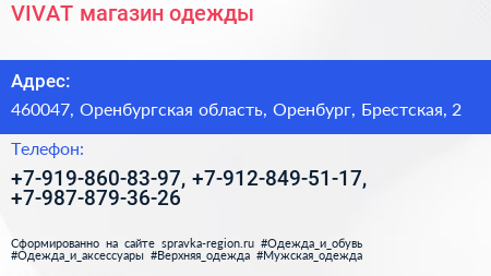 VIVAT, магазин одежды по адресу 460047, Оренбургская область, Оренбург, Брестская, 2 в дальнейшем Организация, размещена в следующих категориях: