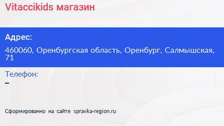 Vitaccikids, магазин по адресу 460060, Оренбургская область, Оренбург, Салмышская, 71 в дальнейшем Организация, размещена в следующих категориях: