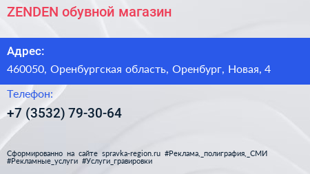 ZENDEN, обувной магазин по адресу 460050, Оренбургская область, Оренбург, Новая, 4 в дальнейшем Организация, размещена в следующих категориях: