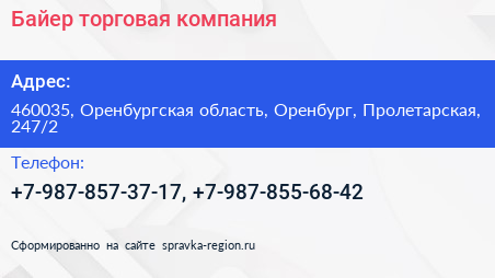 Байер, торговая компания по адресу 460035, Оренбургская область, Оренбург, Пролетарская, 247/2 в дальнейшем Организация, размещена в следующих категориях: