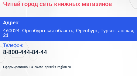 Читай-город, сеть книжных магазинов по адресу 460024, Оренбургская область, Оренбург, Туркестанская, 21 в дальнейшем Организация, размещена в следующих категориях: