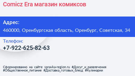 Comicz Era, магазин комиксов по адресу 460000, Оренбургская область, Оренбург, Советская, 34 в дальнейшем Организация, размещена в следующих категориях: