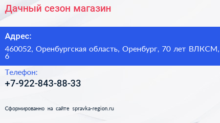 Дачный сезон, магазин по адресу 460052, Оренбургская область, Оренбург, 70 лет ВЛКСМ, 6 в дальнейшем Организация, размещена в следующих категориях: