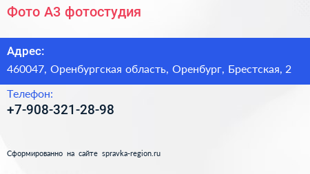 Фото А3, фотостудия по адресу 460047, Оренбургская область, Оренбург, Брестская, 2 в дальнейшем Организация, размещена в следующих категориях: