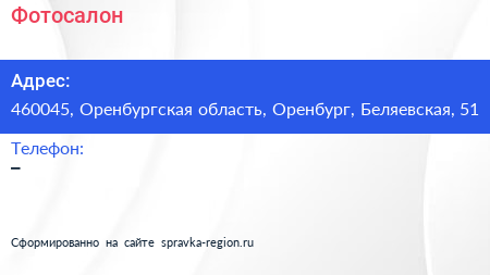 Фотосалон по адресу 460045, Оренбургская область, Оренбург, Беляевская, 51 в дальнейшем Организация, размещена в следующих категориях: