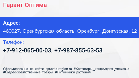Гарант Оптима по адресу 460027, Оренбургская область, Оренбург, Донгузская, 12 в дальнейшем Организация, размещена в следующих категориях: