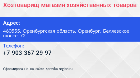 Хозтоварищ, магазин хозяйственных товаров по адресу 460555, Оренбургская область, Оренбург, Беляевское шоссе, 72 в дальнейшем Организация, размещена в следующих категориях: