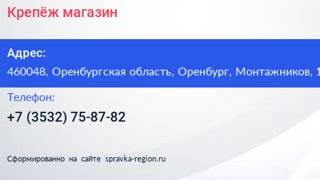 Крепёж, магазин по адресу 460048, Оренбургская область, Оренбург, Монтажников, 1 в дальнейшем Организация, размещена в следующих категориях: