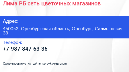 Лима-РБ, сеть цветочных магазинов по адресу 460052, Оренбургская область, Оренбург, Салмышская, 38 в дальнейшем Организация, размещена в следующих категориях: