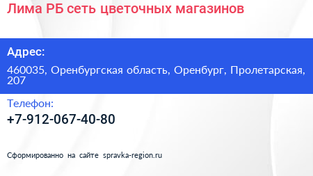 Лима-РБ, сеть цветочных магазинов по адресу 460035, Оренбургская область, Оренбург, Пролетарская, 207 в дальнейшем Организация, размещена в следующих категориях: